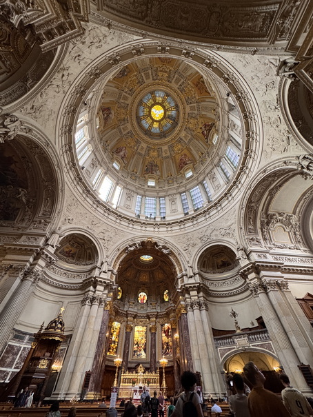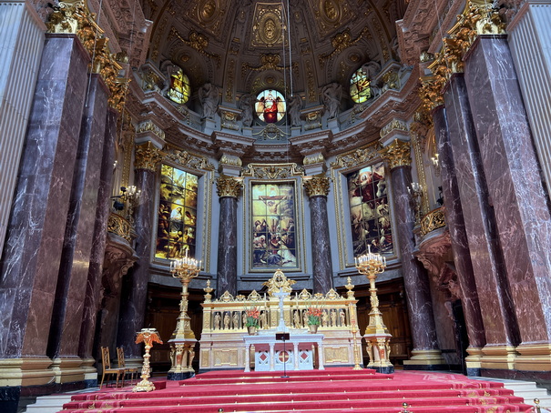 کلیسا جامع برلین در همین جزیره قرار دارد و یکی از مهمترین بناها و نماد شکوه پروتستانتیسم در آلمان است. سنگ بنای این کلیسا در قرن 15 گذاشته شد ولی آنچه امروز می بینیم بین ۱۸۹۴ تا ۱۹۰۵ به دستور ویلهلم دوم آخرین امپراتور آلمان و به سبک باروک-رنسانس ساخته شد. در جنگ جهانی دوم آسیبهای سنگینی دید؛ بخش بزرگی از گنبد ویران شد. بازسازی اصلی از دهه ۱۹۷۰ آغاز و تا سال ۱۹۹۳ تکمیل گشت. معمولا برای بازدید از داخل کلیسا می بایست در یک صف نسبتا طولانی برای خرید بلیط منتظر بمانید. اگر کیف یا ساک دستی بزرگ همراه خود دارید، آن را می بایست به غرفه های بار تحویل دهید. گنبد عظیم 98 متری این کلیسا با نقاشیهای فرشتگان و تمثیلهای مسیحی یکی از قسمتهایی است که مورد توجه بازدیدکنندگان قرار دارد. فضای داخلی با مرمر، طلاکاری، موزاییک و نقاشیهای مذهبی تزیین شده است. محراب ، شیشههای رنگی با صحنههای زندگی مسیح و همچنین ارگ بسیار بزرگ با 7000 لوله از قسمتهای دیگر این کلیسا زیبا هستند. سرداب کلیسا، آرامگاه خانواده سلطنتی هوهنتسولرن با حدود ۹۰ تابوت سلطنتی می باشد. گردشگران میتوانند از پلکان بالا بروند و به سکوی گنبد برسند، از آنجا چشماندازی فوقالعاده به جزیره موزهها و مرکز برلین دیده میشود. بازدید از این کلیسا حداقل به یک ساعت زمان نیاز دارد.