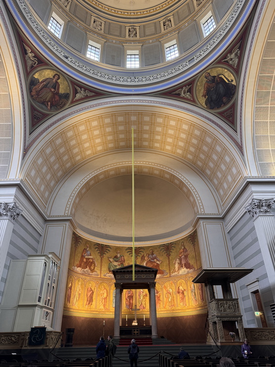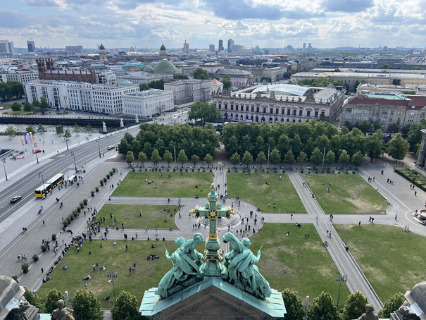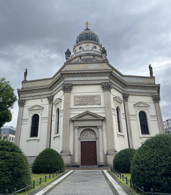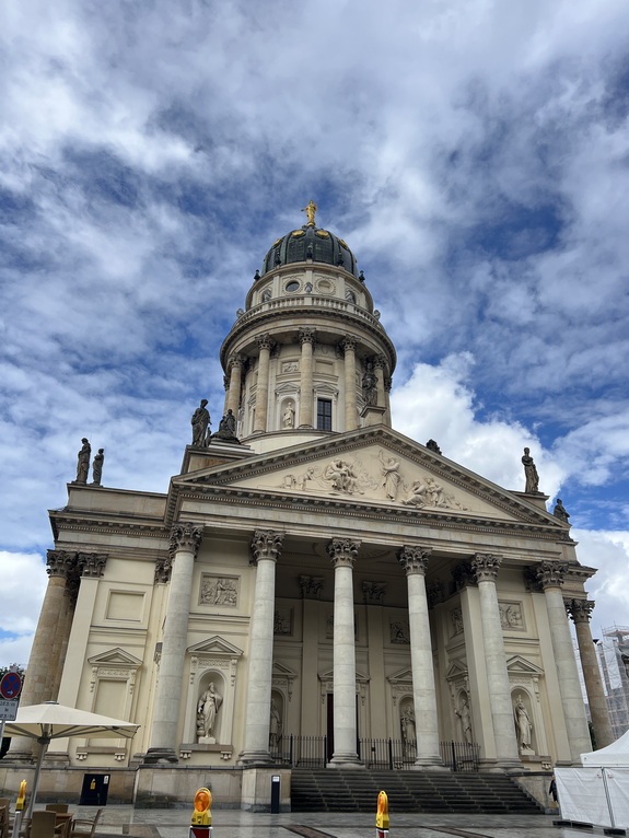 تصمیم گرفتیم تا امروز را با پای پیاده در شهر برلین گردش کنیم. ابتدا به میدان Gendarmen رفتیم. در حال حاضر سه بنای اصلی در این محل وجود دارند که دارای اهمیت هستند. این میدان در تمام طول سال میزبان کنسرتهای فضای باز و جشنوارههاست. مخصوصا بازار کریسمس آن شهرت زیادی دارد. این میدان نمونهای بینظیر از هماهنگی معماری باروک و نئوکلاسیک در برلین است و بسیاری آن را “زیباترین میدان آلمان” مینامند. در زمانی که ما از این محل بازدید کردیم، محوطه و نمای برخی از بناها در حال مرمت بود. جنوبی ترین بنا Neue Kirche یا کلیسا جامع آلمانی نام دارد. امروز بهعنوان بخشی از موزه بوندستاگ (پارلمان آلمان) و نمایشگاه تاریخ دموکراسی در آلمان استفاده میشود. گنبد این کلیسا بسیار بزرگ و زیباست و قرینه ای است از گنبد کلیسای فرانسوی که در ضلع شمالی میدان قرار دارد. این ساختمان نیز اکنون به موزه تاریخ هوگنوها تعلق دارد.