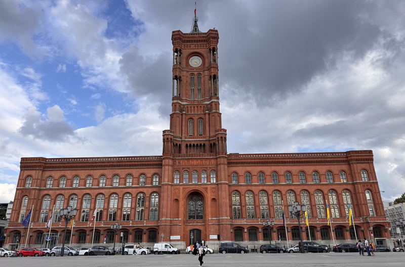 در سوی دیگر ساختمان شهرداری که به تالار شهر قرمز برلین (Rotes Rathaus / Red City Hall)معروف است، قرار دارد. سبک بنا ترکیبی از رنسانس ایتالیا و معماری آجری شمال آلمان است. نمای بیرونی دارای طاقها و ستونهای تزیینی و یک برج مرکزی بلند ۷۴ متری است. برج با ساعت بزرگی زینت یافته که امروزه هم از قسمتهای قابلتوجه ساختمان است. طول این ساختمان حدود ۹۶ متر است و به شکل یک بلوک بزرگ مربعی ساخته شده است. در بخش بیرونی ساختمان یک نوار مجسمهکاری (Bilderfries) وجود دارد که تاریخ برلین را در صحنههای مختلف روایت میکند.