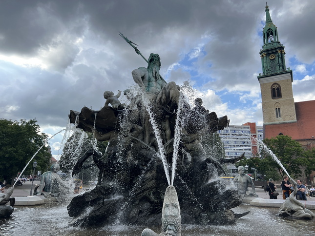 فواره نپتون (Neptune Fountain) بی شک یکی از جذابترین قسمتهای این محل است. از هر طرف که شما نگاه می کنید تعداد زیادی از گردشگران را می بینید که مشغول عکاسی هستند. ساخت این فواره در سال ۱۸۹۱ به سفارش قیصر ویلهلم دوم به راینهولد بگاس (Reinhold Begas)، که یکی از مشهورترین مجسمهسازان سبک نئو باروک در آلمان بود، داده شد. در ابتدا آن را مقابل کاخ سلطنتی برلین (Berliner Schloss) قرار دادند ولی پس از جنگ جهانی دوم به مکان فعلی منتقل شد. در مرکز فواره، خدای دریاها نپتون با یک نیزه سهشاخه (trident) در دست نشسته است. چهار زن مجسمهسازیشده در اطراف او، نماد چهار رود بزرگ پروس در آن زمان هستند: راین (Rhein) ویستولا (Weichsel / Wisła) اُدر (Oder) و البه (Elbe). اطراف فواره با موجودات دریایی، مارماهیها، شیرهای دریایی و موجودات افسانهای تزئین شده است.