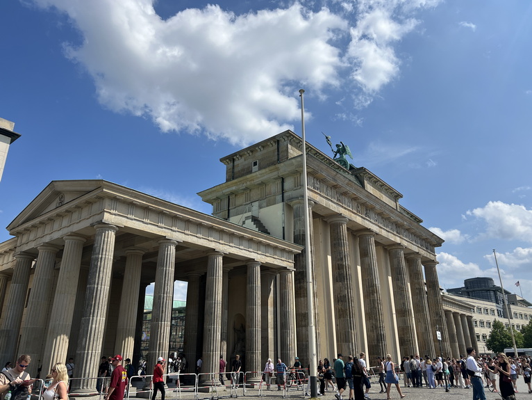 دروازه براندنبورگ نهتنها یادگار دوران شکوه پادشاهی پروس است، بلکه در سدهی بیستم به نماد وحدت آلمان پس از فروپاشی دیوار برلین تبدیل شد. این دروازه درابتدا به عنوان ورودی باشکوه شهر برلین ساخته شد. طراحی آن بر اساس دروازه پروپیلئا (Propylaea) در آکروپولیس آتن انجام گرفت تا نشانهای از شکوه، صلح و عقلانیت باشد. دروازه دارای 12 ستون دوریایی با 5 گذرگاه است که گذرگاه میانی در گذشته ویژهی عبور خانواده سلطنتی بود. در بالای دروازه، مجسمهای برنزی به نام کوادریگا (Quadriga) قرار دارد(ساخته شده در سال 1793) و نشاندهندهی الههی صلح ایرنه (Eirene) است که ارابهای چهار اسبه را هدایت میکند. در سال ۱۸۰۶، ناپلئون پس از اشغال برلین، این مجسمه را به پاریس برد. اما پس از شکست در ۱۸۱۴، مجسمه به برلین بازگردانده شد و الهه از آن پس به نماد پیروزی (Victoria) تغییر یافت. در دورهی نازیها، دروازه براندنبورگ به نماد قدرت رایش سوم تبدیل شد. هرچند در جنگ جهانی دوم آسیب دید ولی کاملاً تخریب نشد. پس از ۱۹۶۱، با ساخت دیوار برلین، دروازه در منطقهی مرزی بسته میان شرق و غرب قرار گرفت و غیرقابل دسترسی بود. امروزه دروازه براندنبورگ یکی از مهمترین جاذبههای گردشگری اروپا است، در اطراف آن میدان Pariser Platz با سفارتخانهها (از جمله سفارت آمریکا و فرانسه) و هتلهای تاریخی قرار دارد. ما برای اینکه خاطره بهتری از این میدان با خودمان به یادگار ببریم. در یکی از کافه هایی که میز و صندلی خود را روبروی دروازه براندنبورگ گذاشته بود، نشستیم و نیم ساعت را به مشاهده افرادی که در این محل تردد می کردند، گذراندیم.