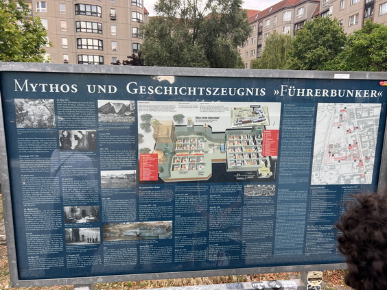 در مسیر برگشت به سمت اتومبیل، از محل بسیار ویژه ای عبور کردیم که فقط یک تابلو راهنما در آن وجود دارد. پناهگاه Führerbunker (فورربونکر)به معنی پناهگاه پیشوا یکی از مهمترین و در عین حال تاریکترین مکانهای تاریخی برلین است. اینجا آخرین سنگر آدولف هیتلر، رهبر آلمان نازی، در روزهای پایانی جنگ جهانی دوم بود، جایی که او در آن دستورهای آخرین عملیاتها را صادر کرد، ازدواج نمود و به روایت تاریخ در نهایت خودکشی کرد.