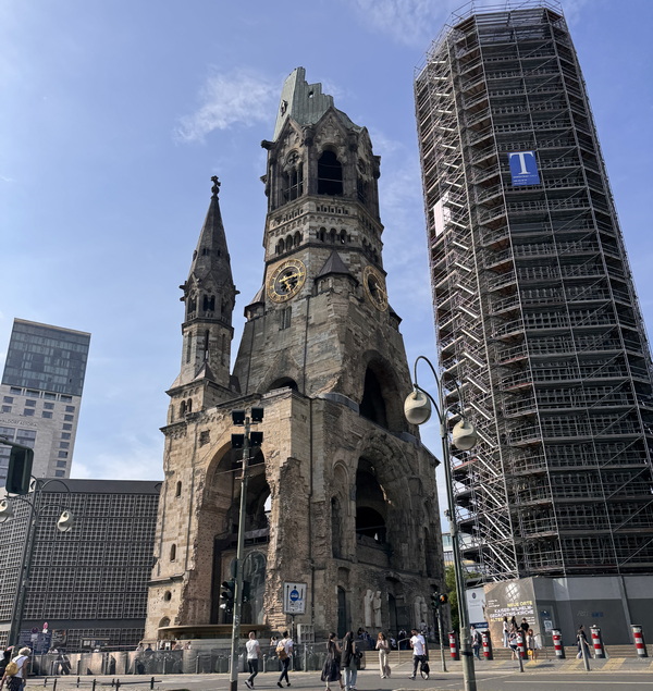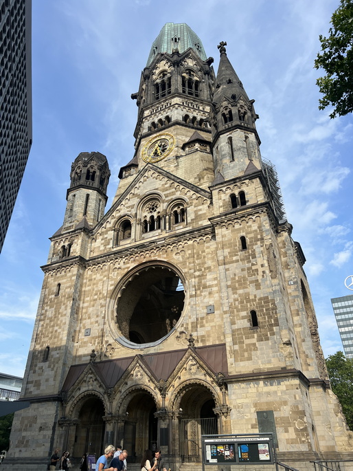 اتومبیل را از پارکینگ برداشتیم و به سمت کلیسا یادبود قیصر ویلهلم حرکت کردیم. در اولین نگاه به نظر می رسد که این کلیسا تخریب شده و یا در حال تخریب است، در حالی که کلیسا از معدود بناهایی بوده که در بمباران سنگین برلین در زمان جنگ تقریبا با وضع موجود باقی مانده است و سعی شده به همان وضعیت حفظ شود. ورودی این کلیسا رایگان است. گفته می شود که برج اصلی آن با ارتفاع ۱۱۳ متر، از دوردستها قابلمشاهده بود و درونش با موزاییکهای طلایی، نقاشیها و شیشههای رنگی تزئین شده بود. اما در بمباران سال ۱۹۴۳، سقف و گنبد فروریخت و تقریباً تمامی تزیینات داخلی نابود شد. اکنون بخشهایی از موزاییکها و نقاشیهای دیواری از زیر آوار نجات یافتند و در اتاق یادبود (Gedenkhalle) در برج باقیمانده نگهداری میشوند.