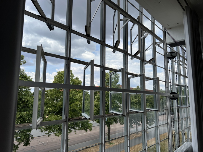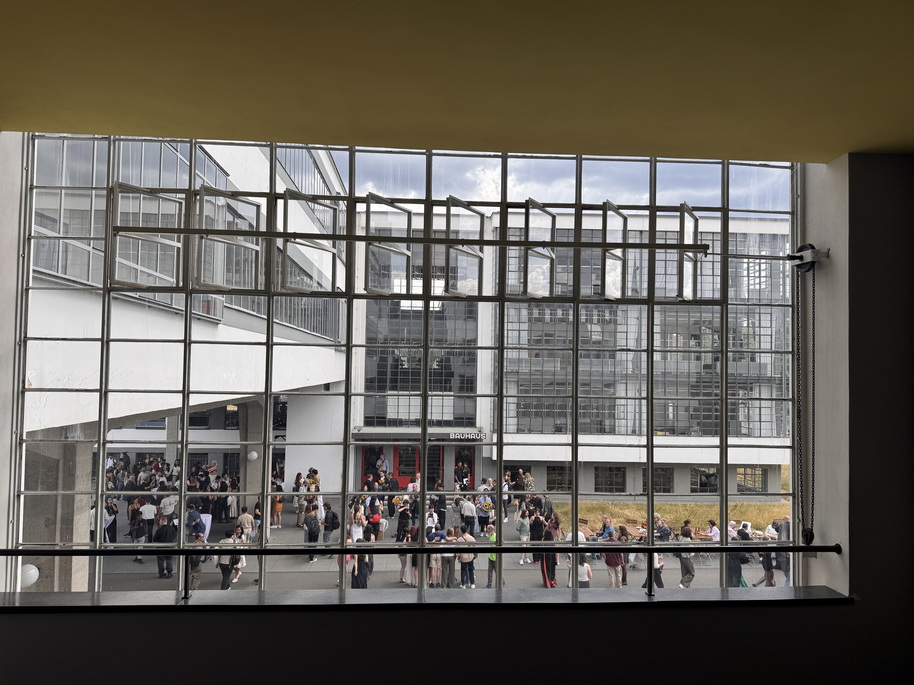 سپس به سرعت به هتل برگشتیم و با اتومبیل به سمت شهر Dessau حرکت کردیم و بلادرنگ خودمان را به ساختمان مرکزی دانشگاه Dessau رساندیم. این ساختمان که یکی از نمادی ترین ساختمانها در تاریخ مدرن جهان محسوب میشود توسط معمار والتر گروپیوس- بنیانگذار مکتب باوهاوس- در سال 1925 برای مدارس Bauhaus ساخته شد. زمانی که ما به این محل رسیدیم در داخل ساختمان اصلی جشن فارغ التحصیلی دانشجویان این دانشگاه در حال برگزاری بود. دانشجویان لباسهای مخصوص فارغ التحصیلی پوشیده بودند و مشغول گرفتن عکسهای یادگاری با همکلاسی ها و والدینشان بودند. بازدید از قسمتهایی از این ساختمان برای عموم امکان پذیر است که شامل یک موزه کوچک از طرح ها و همچنین تصاویر و ماکت هایی از ساختمان هایی است که به این مکتب تعلق دارند. برای من که از معماری چیز زیادی سر در نمی آورم نمای شیشه ای و مکانیزم باز و بسته شدن پنجره های این ساختمان بسیار جالب بود.