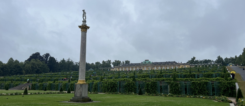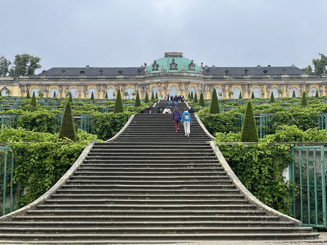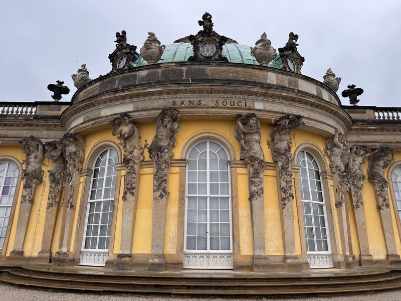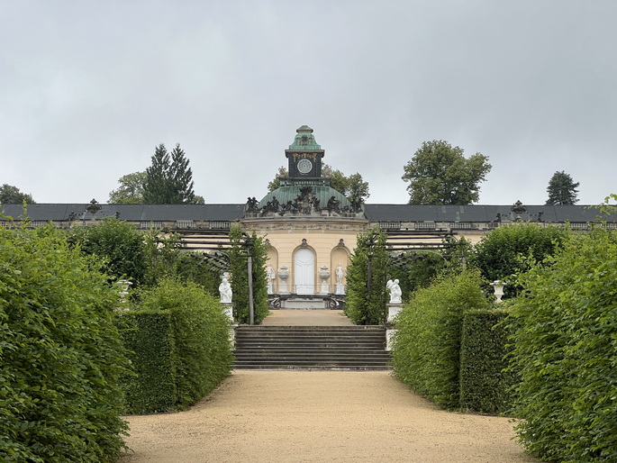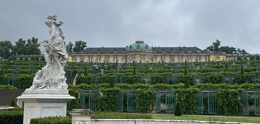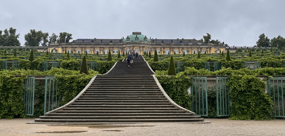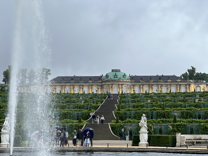 هوا کاملا بارانی بود که از میان کوچه و پس کوچه های پوتسدام خودمان را به ورودی کاخ سن سوسی Schloss Sanssouci (به معنی بی دغدغه) رساندیم. این کاخ معروفترین کاخ شهر پوتسدام و یکی از شاخصترین بناهای تاریخی آلمان است و اغلب آن را با کاخ ورسای فرانسه مقایسه می کنند و به همین دلیل گاهی آن را “ورسای پروس” مینامند. باغهای Sanssouci Park جزو زیباترین پارکهای سلطنتی آلمان هستند. طراحی باغها به سبک باروک و سپس با عناصر منظرهسازی انگلیسی تکمیل شدند. ساختمان اصلی کاخ یک طبقه است و بر فراز تپهای با تراسهای انگور ساخته شده است. این نمای پلکانی که به یک حوض و فواره بزرگ ختم می شود نمای منحصر به فردی به منظره خارجی این کاخ داده است. نمای خارجی ساختمان کاخ با ستونهای کورینتی، مجسمهها و نقشبرجستههای فراوان تزئین شده اند.