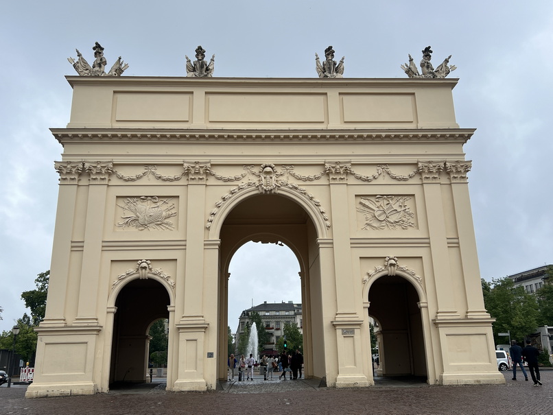 ما پارک را موقتا ترک کردیم تا از دروازه برندنبرگ بازدید کنیم. فاصله این دروازه تا درب اصلی کاخ زیاد نیست و می توان پیاده این مسیر را طی کرد. این دروازه در قرن 18 طراحی شده است و در ابتدای خیابان برندنبرگ ساخته شده است. انتهای این خیابان پیاده رو به کلیسا سنت پیتر و پل ختم می شود و محل خوبی برای پرسه زدن در قلب پوتسدام است. نکته جالب درباره این دروازه این است که طراحی دو سوی آن با هم متفاوت است. سمت شهر (داخل پوتسدام) به سبک رومی-کلاسیک طراحی شده است. سمت بیرونی (رو به برلین) شباهت زیادی به طاق نصرت رومی در رم دارد. تزئینات آن شامل ستونها، تندیسهای پیروزی، و نقشهای کلاسیک است که جلوهای باشکوه به آن بخشیده است. این دروازه در سال 1770 به سفارش فردریک کبیر به مناسبت پایان موفقیتآمیز جنگ هفتساله (1756–1763) ساخته شد.