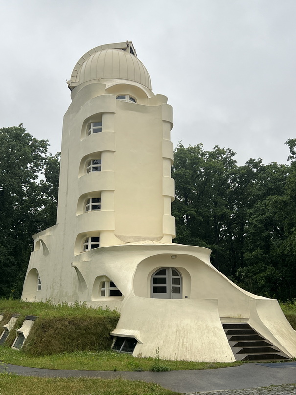 قبل از اینکه پوتسدام را ترک کنیم تصمیم گرفتیم تا از برج اینشتین (Einsteinturm) بازدید کنیم. این برج در منطقه تلهگرافنبرگ (Telegrafenberg) قرار دارد که یکی از مهمترین مراکز علمی و پژوهشی آلمان است. این برج در حد فاصل سالهای 1919 تا 1922 ساخته شد. هدف از ساخت آن رصدخانه ای خورشیدی برای آزمایش تجربی نظریه نسبیت عام آلبرت اینشتین، بهویژه تأثیر گرانش بر نور (انتقال به سرخ گرانشی) بود. سوای از نقش علمی این مرکز، خود این بنا از نظر معماری قابل توجه است. طراحی آن به سبک اکسپرسیونیسم، با فرمهای پویای منحنی و روان و بدون خطوط تیز که بیشتر شبیه به یک پیکر مجسمهای است تا یک ساختمان. مصالح آن از آجر و گچ و سیمان است. در زمانی که ما به این ساختمان رسیدیم، درب اصلی آن بسته بود و نتوانستیم از داخل آن بازدید کنیم.