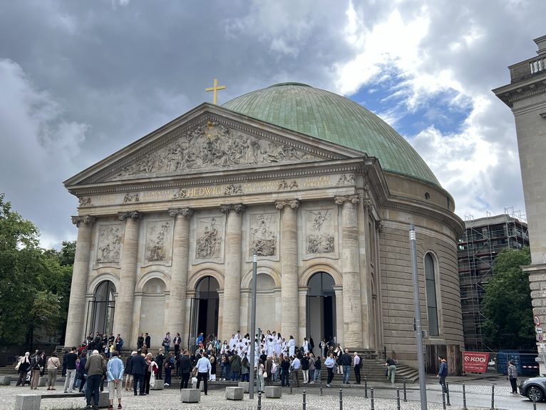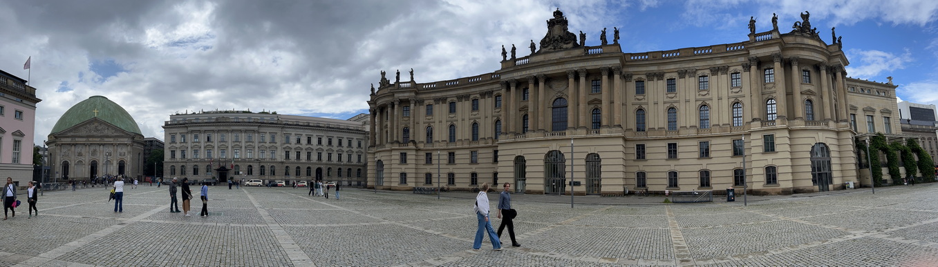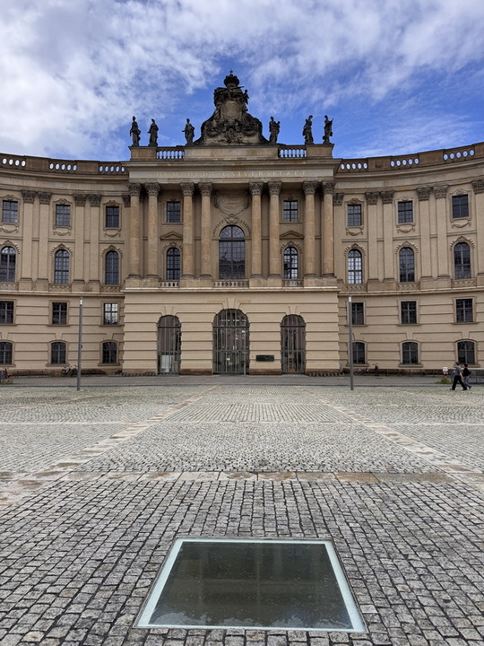 در ادامه مسیر به میدان Bebelplatz رسیدیم. شهرت این میدان به خاطر واقعه کتاب سوزی است که در سال 1933 در آن اتفاق افتاد و 20 هزار جلد کتاب متعلق به نویسندگان یهودی، لیبرال، و منتقد حکومت نازی ها در این مکان به آتش کشیده شد. امروزه یک یادمان شیشهای زیرزمینی اثر Micha Ullman در وسط میدان قرار دارد. بازدید کنندگان از طریق یک شیشه کوچک که در کف زمین قرار دارد می توانند کتابخانهای خالی با قفسههای سفید، که یادآور آن واقعه است را ببینند. اطراف این میدان بناهای مهمی مثل اپرای دولتی برلین، ساختمان اصلی دانشگاه هومبولت (دانشمندانی چون هگل، انیشتین و برادران گریم در آن تدریس یا تحصیل کردهاند) و کلیسای جامع کاتولیک سنت هدویگ قرار دارند. این کلیسا با یک گنبد عظیم سبز رنگ، در میانه قرن 18 به دستور فریدریش کبیر برای جامعه کاتولیک ساخته شد و معماری آن الهامگرفته از پانتئون رم است. فضای داخلی آن بسیار ساده است و طراحی مدور آن باعث میشود تا همه صندلیها به محراب نزدیک باشند. جالب است که فریدریش کبیر، با وجود پروتستان بودن، اجازه ساخت این کلیسا را داد تا نشان دهد پروس کشوری با مدارا و تنوع مذهبی است.