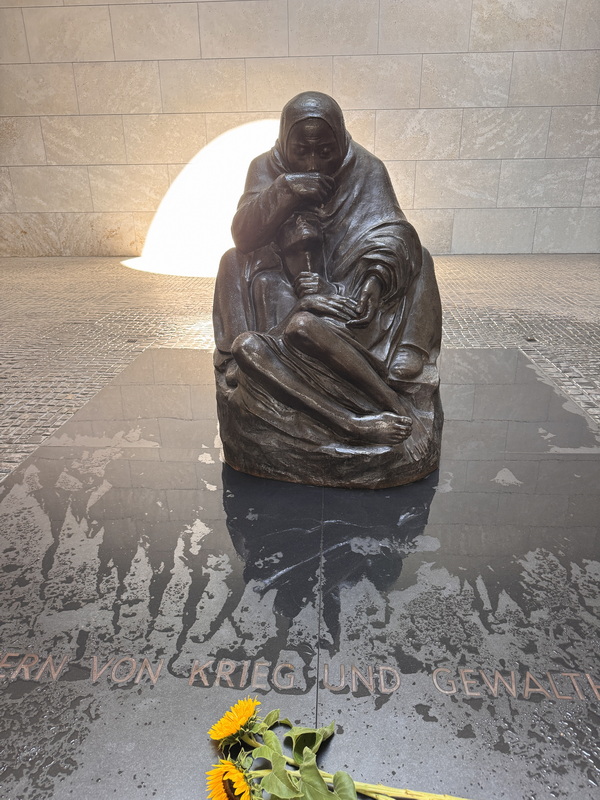 درست در آن سوی خیابان بنای یادبود قربانیان جنگ و دیکتاتوری در برلین قرار دارد این بنا به Neue Wache (به معنی نگهبانی جدید) معروف است. این بنا در اوایل قرن 19 به دستور فریدریش ویلهلم سوم (پادشاه پروس) به منظور پادگان و ساختمان نگهبانی سلطنتی برای حفاظت از کاخ شهر برلین ساخته شد. نمای اصلی شبیه به معبد یونانی با ستونهای دوریک است. فضای داخلی ساده و سنگین، با دیوارهای خالی و نورگیر دایرهای در سقف است. مجسمهی مشهور “مادر با پسر مرده” (Mother with her Dead Son) اثر کیت کولویتس درست زیر نورگیر قرار دارد، بهگونهای که باران و برف از سقف به داخل میریزند و بدین ترتیب نمادی از رنج و آسیبپذیری انسان به نمایش گذاشته می شود. بازدید از این بنا رایگان است و حداقل نیاز به نیم ساعت زمان دارد.