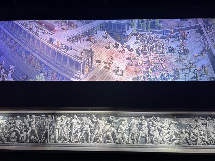 از اینکه با درب بسته موزه پرگامون مواجه شدیم خیلی ناراحت شدم. مخصوصا بعد از سفر عراق، متوجه شده بودم که آلمانیها کاوشهای باستانی خیلی مهمی را در این منطقه انجام داده اند و بسیاری از آثار کشف شده را به موزه پرگامون منتقل کرده اند. همچنین آثار مهمی از مناطق غربی ترکیه امروزی در این موزه نگهداری می شوند. به دوستان پیشنهاد دادم حداقل نمای ساختمان جدید را از نزدیک ببینیم که به ساختمانی که روی آن نوشته بود “موزه-پاناراما پرگامون” برخوردیم. این بنا در سال 2018 افتتاح شد. از آنجا که بخش بزرگی از موزه پرگامون در حال بازسازی طولانیمدت است . برای اینکه بازدیدکنندگان همچنان تجربهای زنده از شکوه آثار پرگامون داشته باشند، این موزه-پانوراما ساخته شد. در ابتدای ورود وارد موزه ای می شوید که به نمایش قطعاتی از محراب پرگامون، آثار یونان و روم باستان و توضیحاتی درباره باستانشناسان آلمانی که در قرن ۱۹ و اوایل قرن ۲۰ در پرگامون حفاری کردند، اختصاص داده شده است. بازدید از این موزه کمک میکند تا آثار تاریخی که در موزه پرگامون به دلیل بازسازی در دسترس نیستند، بهصورت زنده تجربه شوند. اما جالبترین قسمت این مجموعه متعلق به پانورا پرگامون است که یک نمونه بینظیر از کاربرد فناوری مدرن در بازآفرینی تاریخ باستان است.
