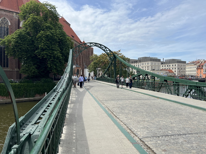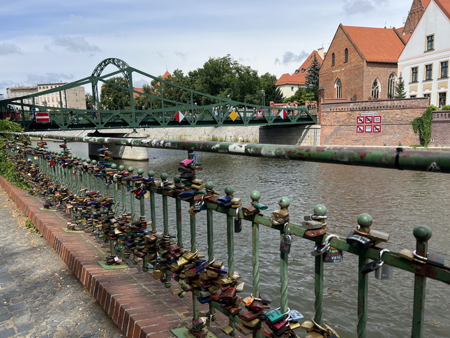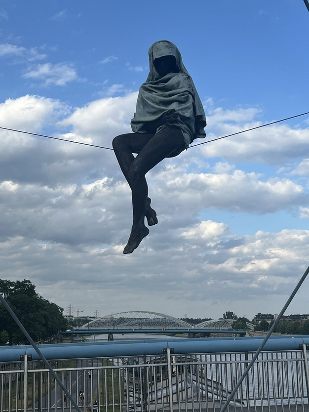 تقریبا ساعت 6 عصر وارد شهر کراکوف شدیم و تصمیم گرفتیم از محله قدیمی کازیمیرز (Kazimierz) بازدید کنیم. اتومبیل را در کنار پل پدر برناتک (Father Bernatek Footbridge) یا به لهستانی (Kładka Ojca Bernatka) پارک کردیم. این پل که بر روی رودخانه ویستولا در سال 2010 احداث شده است، محلههای کازیمیرز و پودگورژه را به هم وصل میکند. این پل قوس فولادی زیبایی دارد که بهطور هوشمندانه با دو مسیر مجزا برای عابران پیاده و دوچرخهسواران طراحی شده و تقریباً ۱۳۰ متر طول دارد. در طول پل، ده مجسمه آکروباتیک معلق اثر هنرمند لهستانی Jerzy Kędziora دیده میشوند که حس تعلیق و سبکبالی را ایجاد میکنند. بهدلیل زیبایی و فضای رمانتیک، زوجهای زیادی قفل عشق به نردههای پل میآویزند و کلید را در رود ویستولا میاندازند. این پل بهنوعی به «پل عشق» محلی معروف شده است.