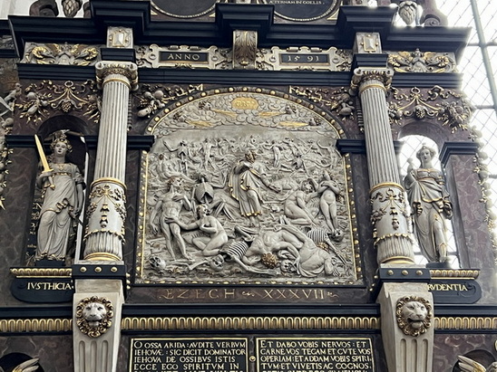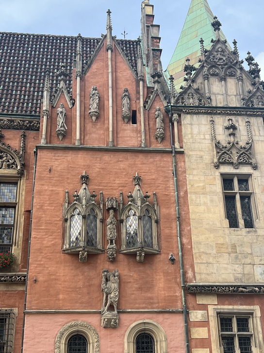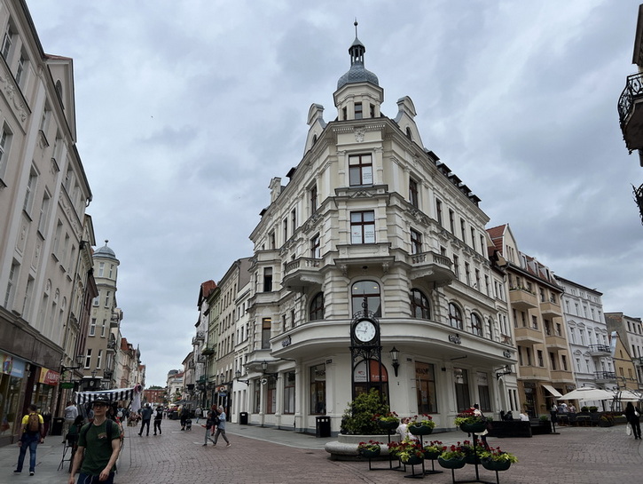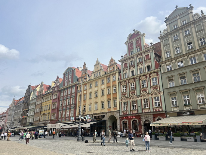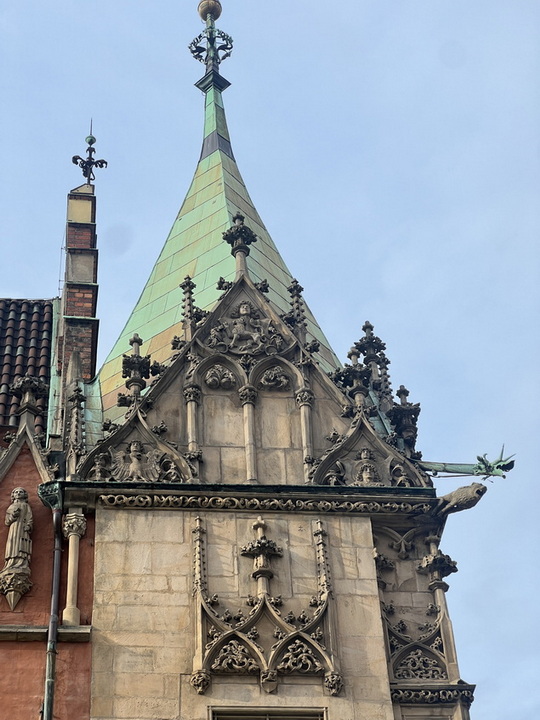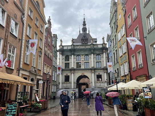 از کوچه کناری کلیسا وارد خیابان سنگفرشی دووگا (Długa) شدیم. این خیابان که به “خیابان طولانی” معروف است یکی از زیباترین خیابانهای شهر گدانسک است و بخشی از مسیر تاریخی مشهور به راه سلطنتی (Royal Route) به شمار میرود. این خیابان همراه با میدانDługi Targ (بازار طولانی) قلب تاریخی و پرشکوه شهر را تشکیل میدهد. در این خیابان خانهها و عمارتهای زیبای متعلق به بازرگانان ثروتمند ساخته شده که با نمایی رنگارنگ و تزیینات رنسانس، باروک و نئوکلاسیک جلوهای ویژه دارند. البته بسیاری از آنها در زمان جنگ آسیب زیادی دیدند که بعدا مرمت شدند. ابتدای خیابان با دروازه Brama Złota شروع می شود. نام دیگر آن “دروازه طلایی” است. این دروازه یک ساختمان دو طبقه است و دارای طاق ورودی بزرگ و باشکوه می باشد. نمای آن با مجسمهها و کتیبههای نمادین تزئین شده است. در سمت غربی (رو به شهر) چهار مجسمه نشاندهنده صلح، آزادی، ثروت و شهرت هستند و در سمت شرقی (رو به خیابان Długa) چهار مجسمه دیگر عدالت، پرهیزکاری، خرد و توافق قرار دارند. سبک کلی آن ترکیبی از رنسانس و باروک است که شکوه و اهمیت گدانسک به عنوان یک شهر بندری ثروتمند را نشان میدهد.