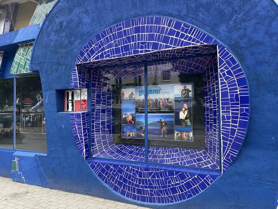یک ساختمان با نمای کاشی لعابدار که تصویر چند مرد و زن را در حال رقص نشان می دهد در همین مکان ساخته شده است که نظر ما را به خود جلب کرد.