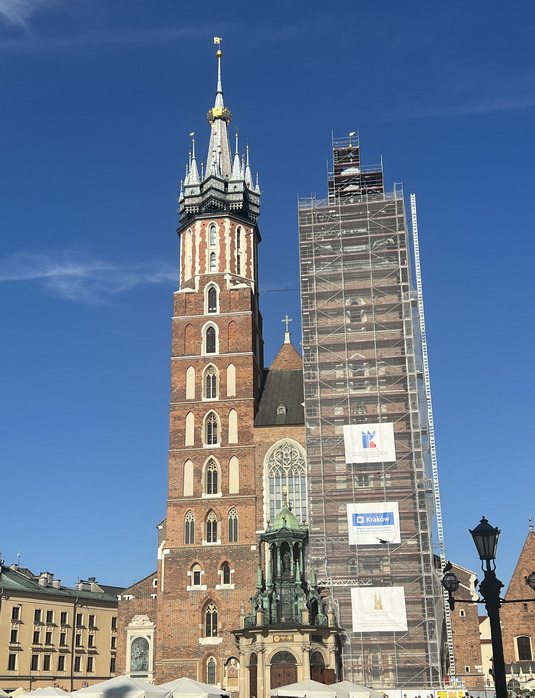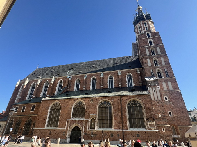 در ضلع شمال شرقی میدان شهر، باسیلیکا سنت ماری قرار دارد. این کلیسا دارای دو برج نامتقارن است: برج بلندتر ۸۰ متر ارتفاع دارد و هر یک ساعت از آن آهنگی به نام Hejnał mariacki با ترومپت نواخته میشود، که یکی از صداهای نمادین شهر است و در هنگامی که نواخته میشود بهطور ناگهانی قطع میشود که یادآور افسانهای درباره تیر خوردن یک نگهبان در هنگام هشدار حمله مغولها است. برج کوتاهتر (۶۹ متر) است که قبلاً بهعنوان برج مراقبت استفاده میشد. این دو برج در قرون وسطی توسط دو برادر معمار ساخته شدهاند، و افسانهای محلی درباره رقابت آنها وجود دارد که منجر به قتل یکی توسط دیگری شد. فضای داخلی کلیسا یکی از زیباترین نمونههای گوتیک در اروپا است. سقف با رنگ آبی تیره و ستارههای طلایی، بسیار چشمگیر است. دیوارها با نقاشیهای قرن نوزدهمی به سبک نئوگوتیک تزئین شدهاند. محراب چوبی منبتکاریشده آن به دست هنرمند آلمانی Veit Stoss Wit Stwosz ساخته شده (حدود 1477–1489) و از بزرگترین محرابهای گوتیک در جهان با بیش از ۲۰۰ پیکره چوبی تزیین شده است.