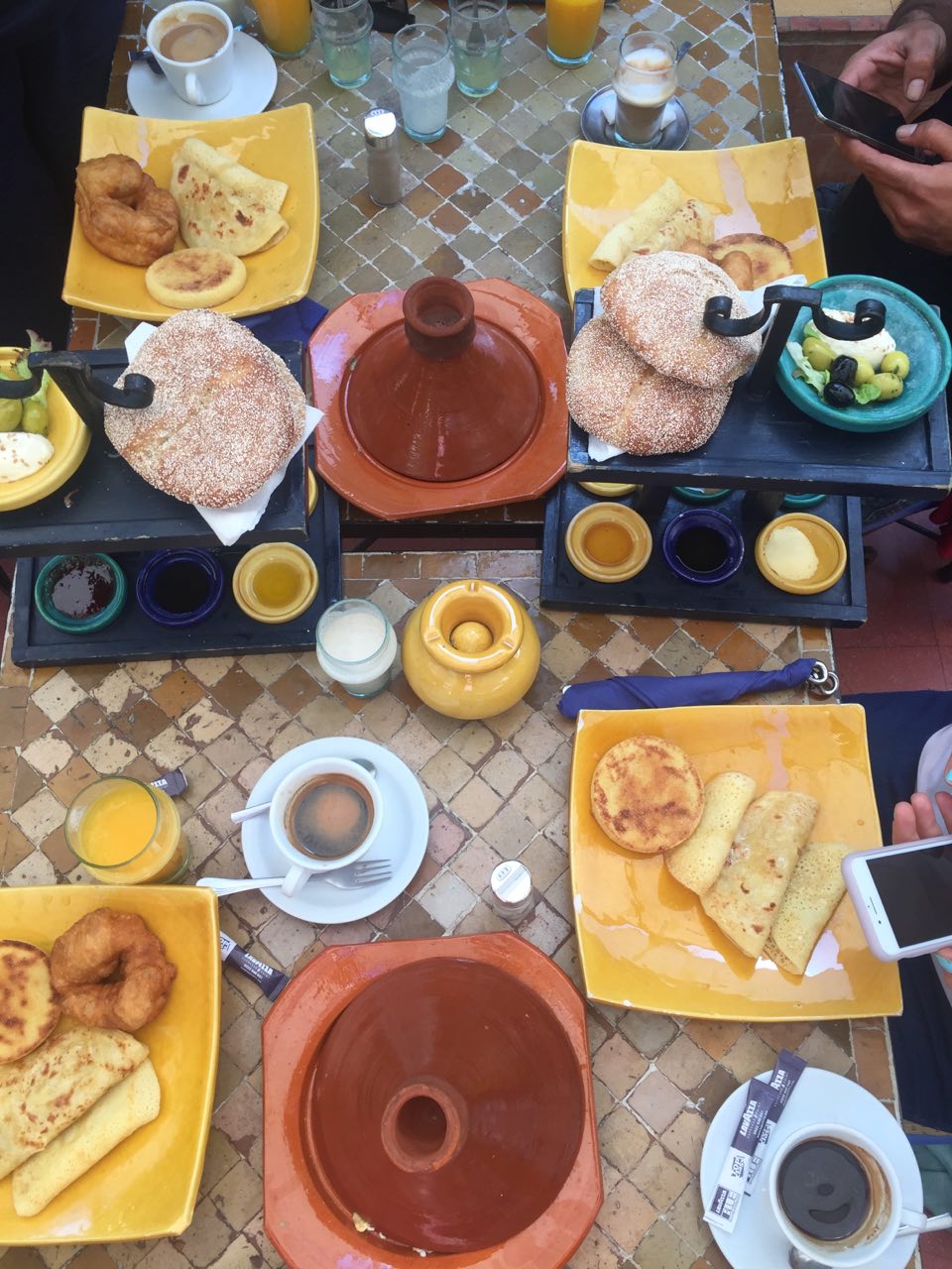 یک نکته درباره کافه های مراکشی. اگر کافی شاپ شیک رفتید که امیدوارم خوشمزهترینها را بخورید ولی اگر کافه های سنتی رفتین این توضیح را بدهم که فقط قهوه و چای دارند. مثل کافه های ما شیرینی و کیک و اسنک و … ندارند. فقط مکانی برای نوشیدن چای و قهوه هستند. میتوانید شیرینی سنتی مراکشی خریده و به کافه ها ببرید و با نوشیدنیتان بخورید. و اگر چای مراکشی سفارش دادید حتما تاکید کنید که بدون شکر. چون به قدری شیرین میکنند که قابل خوردن نیست. ولی میتوانید جداگانه شکر یا قند سفارش دهید.