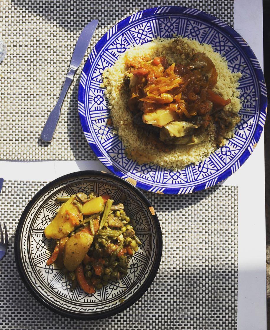 غذا: غذاهای مراکشی واقعا خوشمزه هستند. و مثل ایران سبک آشپزی خودشان را دارند. البته ادویه هم خیلی استفاده میکنند اگر ادویه دوست داشته باشید که مراکش بهشت شماست. غذاهایی که حتما باید امتحان کنید، تاژین tagine هست که توی ظرفهای مخصوص سرو میشود. تاژین، سبزیجات پخته شدهس که به انتخاب شما با گوشت، مرغ، ماهی و یا کاملا گیاهی سرو میشود. غذای دیگر تانژیا tangia که شبیه دیزی است و در ظرفهای مخصوص و به نوع خاص سرو میشود و آماده شدنش معمولا خیلی طول میکشد. اگر جایی خواستید این غذا را سفارش بدهید، مطمئن شوید که غذا را آماده دارند و یا شما وقت کافی برای انتظار دارید. کوفته kefta که مثل کباب کوبیدهس ولی لقمهای با یکسری ادویه و مواد دیگر. کوس کوس couscous، روز جمعه تمام مراکشیها ناهار کوس کوس میخورند. خیلی جالبه تجربهش. اگر توانستید یک جمعه برای خوردن کوس کوس برنامهریزی کنید. شوا chwa، ساندویچ مراکشی که گوشت، مرغ، سوسیس یا جگر کبابی با زیتون فراوان و سیب زمینی سرخ کرده هست. اگر در منو سالاد مراکشی دیدید، بدانید که دارید سالاد شیرازی بدون نعنا و آبغوره سفارش میدهید. رفیسه rfissa چیزی شبیه پاستا که با مرغ پر ادویه سرو میشود. یک سری پیش غذا هم دارند که معروف ترینشان بادمجان و گوجهس و اسمش زالوک zaalouk و یکی دیگر هم فلفل دلمهای و گوجهس که اسمش تاکتوکا taktouka. یک صبحانه مخصوص هم دارند که ترکیب گوشت خشک شده هست با تخم مرغ به اسم خلیی khlii.
