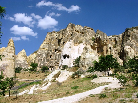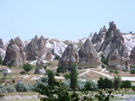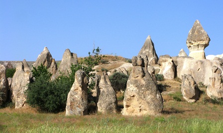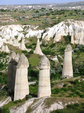 پس از گذر از شهر Avanos و در مسیر Goreme کم کم می توانید اشکال عجیب و غریب عوارض سطح زمین را ببینید. این مناظر در حدفاصل Cavusin به Goreme به حداکثر خود می رسد. این عوارض طبیعی عمدتا کوههای کوتاه استوانه ای شکل با نوک تیز هستند که طول برخی از آنها به ۱۰۰ متر هم می رسد. جنس آنها از توفهای آتشفشانی است لذا به سختی سنگهای معمولی نیستند و به سادگی می توان در آنها حفاری انجام داد و شاید این موضوع سبب شده که در روزگار گذشته با حفر اتاقکهایی از آنها به عنوان خانه استفاده شود.