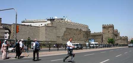با ادامه مسیر، به دیوار محافظ و برج و باروهای دور شهر رسیدیم. این دیوار در قدیم با چند دروازه مستحکم از شهر محافظت می کرد و هنوز قسمتهایی از آن وجود دارد و مقداری هم مرمت شده اند.